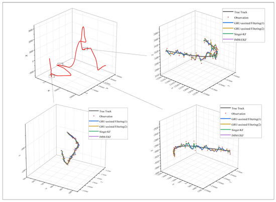 Furthermore, we observed that the reduction in error mainly occurred after model changes, demonstrating the ability of GRU-assisted motion model estimation to promptly reflect mode transitions. There was no significant difference between GRU-assisted filtering (1) and GRU-assisted filtering (2). The smaller RMSE of GRU-assisted filtering (2) may have been due to the retention of some states from other models during model transitions, which increased fault tolerance and mitigates the impact of model weight switching between 0 and 1 at incorrect time steps.