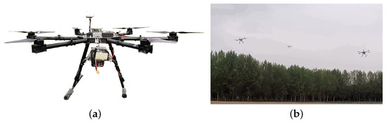To further evaluate the effectiveness of the proposed algorithm, flight experiments were conducted using three hexacopter UAVs developed in our laboratory [30]. As shown in Figure 10a, the UAVs were equipped with Langyu SUNNYSKY X5212S brushless motor multirotor motors, Tattu 30,000 mAh batteries, and the DJI A3 flight control system, providing flight endurance of 25 min. Three sets of flight experiments were carried out with different durations, namely 1194 s, 1243 s, and 1223 s. Each UAV was equipped with a BeiDou receiver (SinoGNSS M600mini) to record its real-time position. During each flight experiment, the three UAVs formed a swarm for cooperative flight, as shown in Figure 10b. The centroid trajectories of the swarm during cooperative flight, as depicted in Figure 11, consisted of multiple maneuvering segments. Within the maneuvering capabilities of the UAVs, the specific maneuvers performed were randomly generated by pre-programmed ground routines. Additionally, the YAOFENG RADAR YFR-01C was employed to record radar observations of the UAVs for predicting the motion model and trajectory filtering. The scan interval of the radar was 0.5 s.