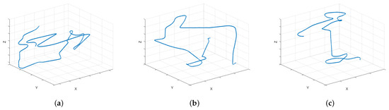 Flight trajectories with different durations of (a) 1194 s, (b) 1243 s, and (c) 1223 s.
