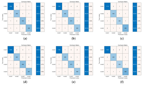 Confusion matrix of three flight experiments with networks trained by simulation and actual observations. (a) The 1194 s flight with a simulated network. (b) The 1243 s flight with a simulated network. (c) The 1223 s flight with a simulated network. (d) The 1194 s flight with a retrained network. (e) The 1243 s flight with a retrained network. (f) The 1223 s flight with a retrained network.