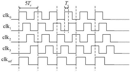 In this sub-section, this paper presents an adaptive estimation method that utilizes the first-order statistics to address the timing mismatches. The estimation model is based on a four-channel model with an additional channel for reference. The sampling frequency of TIADC is . The sampling frequency of the sub-channel is . The sampling frequency of the reference channel is . The sampling values of the reference channel are aligned with each sub-channel in turn. The sampling timing of each sub-channel ADC and the reference channel ADC is illustrated in Figure 3.