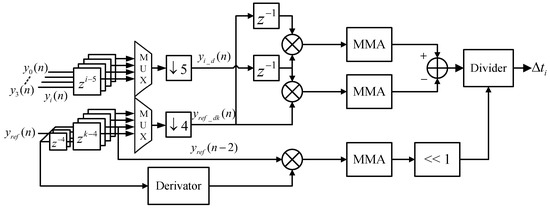 In this paper, an all-digital calibration structure is proposed to address the aforementioned issues. A reference channel is used to extract the timing mismatch of each sub-channel. The compensation structure is formulated based on the expansion of the first-order Taylor series. The derivator which is optimized with the Richardson extrapolation is based on the first-order numerical differential of the Lagrange interpolation polynomial of the 5-point formula. The optimization of the derivator circuit’s structure, as is outlined in this paper, aims to minimize the hardware consumption and the overall resource utilization. In addition, an auxiliary circuit is introduced to further enhance the output precision and performance, which improves the overall accuracy and efficiency. This design manifests attributes including the expeditious convergence, the compact hardware footprint, and the straightforward architectural framework. This paper is organized as follows. Section 2 describes the construction of the TIADC module and the merits of the proposed calibration technique. Section 3 shows the simulation results which verify the effectiveness of the technique. Section 4 is mainly used to discuss the advantages and disadvantages of the proposed algorithm as well as the direction of the future work. Finally, the conclusions are drawn in Section 5.