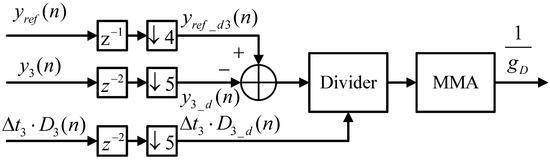 where the expectation of , and are constants on account of the input signal that is band-limited. The calibration architecture of the derivator’s deviation according to (29) is shown in Figure 7.