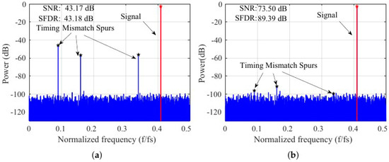 Figure 8 shows the spectra of a single-tone signal with a frequency of 0.41f_s. The timing mismatches of the four channels are set as [1‰, −2‰, 3‰, −4‰]. After calibration, the harmonics that are caused by the timing mismatches decrease substantially. The SFDR and SNR increase from 43.81 dB and 43.17 dB to 89.39 dB and 73.50 dB, respectively.