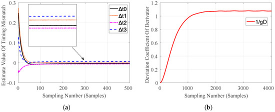 Figure 10a shows the convergence rate of the timing mismatches. In the actual simulation, the channel rotation method is used to estimate the timing mismatch of each channel. It can be observed that the typical channel switches after approximately 300 samples. The convergence rate of the derivator’s deviation coefficient is shown in Figure 10b, and the convergence samples are approximately 2000. The entire system reaches convergence at approximately 3200 samples. The deviation value is around 1.075 when the is 0.41.