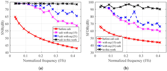 Figure 11 shows a significant improvement of the SNR and SFDR under different frequencies. The output performance shows little difference at the low frequencies, but the unmodified structure exhibits a noticeable decrease in performance at the higher frequencies. Moreover, the proposed calibration architecture effectively maintains a stable and high level of the SNR and SFDR in almost the entire Nyquist domain.