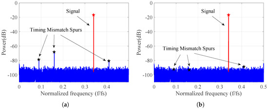 Based on the measured data from the 2 GS/s four-channel 12-bits TIADC, the proposed method is used for the off-chip calibration. The input is a single-tone signal with a frequency of 680 MHz (=). Figure 14 shows the off-chip calibration results of the commercial TIADC. It can be seen that the spurs caused by the timing mismatch at the frequencies of 0.09, 0.16 and 0.41 are reduced by 15.09 dB, 26.67 dB, and 12.65 dB, respectively.