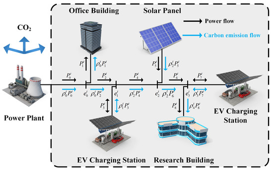 By integrating the V2G carbon accounting model, it can be extended to calculate the dynamic NCI at each node of the DS. Figure 2 displays a schematic diagram of a campus DS with power flow and carbon emission flow. The DS includes office buildings and research buildings as base loads, distributed photovoltaic panels representing renewable energy sources, and EV charging stations with V2G technology.