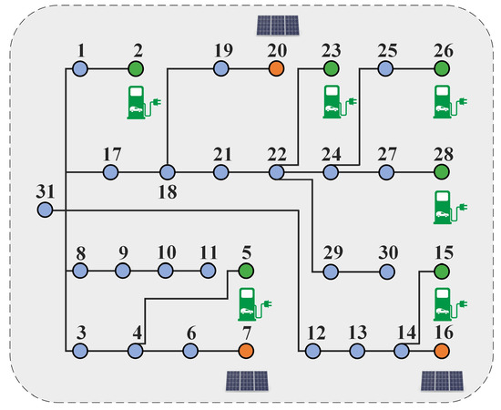 The DS discussed in this paper is based on the SUSTech campus. This DS has 31 nodes and 30 branches, where node 31 is a balance node connected to the Guangdong Provincial Power Grid through a 110 kV/10 kV transformer. Private EV charging stations are distributed at nodes 2, 5, 15, 23, 26, and 28. When the EVs connected to these charging stations are in the discharging state under the V2G mode, these nodes can be considered as power source nodes. At nodes 7, 16, and 20, there are three sets of PV panels installed, which can generate electricity using solar energy and supply it to the DS. The specific structure of the DS is shown in Figure 3.