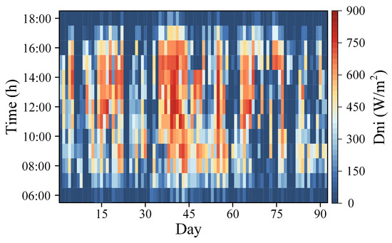 In this study, real solar irradiance records were obtained from the global climate database [42], selecting genuine solar irradiance data for the summer months (June to August) at the Southern University of Science and Technology. The data sampling interval was 60 min. Figure 4 shows the distribution of solar irradiance during the summer of 2023 on the Southern University of Science and Technology campus, with the peak irradiance occurring between 11:00 AM and 1:00 PM. The level of solar irradiance in July was higher than in June. Due to a higher frequency of rainy days in August, there were some days without any significant solar irradiance throughout the entire day, resulting in the average irradiance for August being lower than that in June and July.