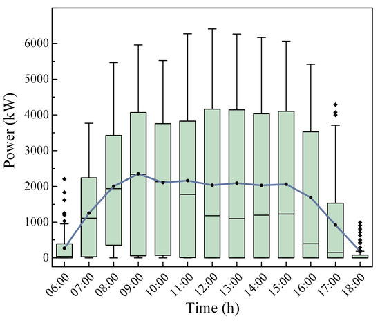 Based on the actual solar irradiance data of the SUSTech campus, the hourly photovoltaic power generation distribution was obtained. By taking the average power generation for each time period [45], a typical day’s photovoltaic power generation profile for the summer was established, as shown in Figure 5.
