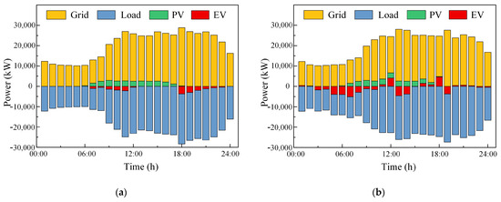 Figure 8 illustrates the power balance of the campus distribution network before and after low-carbon scheduling, taking into account the DS composed of the public power grid, the campus base load, the PV, and EV components. According to the optimization results, the charging and discharging strategy of EVs mainly depends on the carbon emission intensity of the power grid. As shown in Figure 8b, after optimization, EVs concentrate most of their charging needs between 3:00 AM and 9:00 AM, a period when the grid’s carbon emission intensity is relatively low. During times of highest carbon emission intensity, EVs discharge to the grid, reducing the base load demand for high CI electricity from the grid, thereby decreasing the carbon emissions from electricity use in the DS.