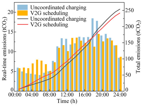 Due to the fluctuations in the power grid’s CEF with changes in the load conditions of the electric power system, V2G can produce additional emission reductions compared to conventional EV charging by utilizing EVs in conjunction with low carbon scheduling.