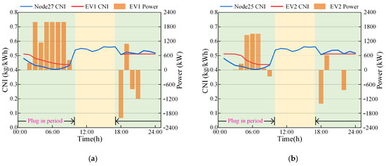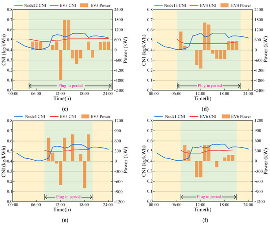 Figure 11 illustrates the real-time variations in the CI of six types of EVs as well as the NCI of upstream nodes, to analyze the relationship between EV carbon emissions and CI. Figure 11a,b depicts the changes in CI and their charging/discharging power for EV1 and EV2. During the 18:00–22:00 period, the CI of EVs is lower than the NCI of upstream nodes, and both EV1 and EV2 discharge to the grid to reduce the carbon emissions of the upstream node’s base load. From 1:00 to 9:00, the NCI of upstream nodes is lower than that of EVs, and both EV1 and EV2 primarily charge during this period to reduce the carbon emissions associated with EV charging. Additionally, the CI of EVs gradually decreases during the charging process, reaching values of 0.4383 kg CO2/kWh and 0.4379 kg CO2/kWh when leaving the grid, showing a reduction compared to when they were connected. EV3, EV4, EV5, and EV6 connect to the grid during periods of high carbon emission factor, as shown in Figure 11c–f. When the NCI of upstream nodes is high, these EVs discharge to the grid to reduce the system’s carbon emissions. Conversely, when the NCI of upstream nodes is low, the EVs charge to reduce the carbon emissions associated with EV charging. Compared to when they first connect to the grid, the CI of EV3, EV5, and EV6 have all increased, while the EV4 upstream nodes have PV power injection during the 7:00–8:00 and 13:00–14:00 periods, reducing the NCI between upstream nodes and EV4. However, due to EV4 discharging low-carbon power to the system’s base load, it reduces the system’s carbon emissions.