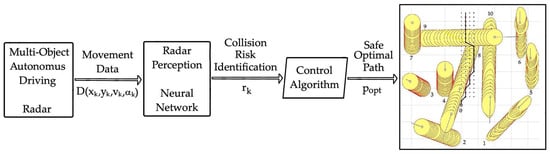 First, the process of autonomous driving of multiple objects was characterized, presenting its functional diagram, which consists of the radar perception of detecting and tracking objects, identification of their collision risk using an artificial neural network, and then a multi-stage dynamic programming algorithm for making maneuvering decisions. The next section describes the details of radar perception of collision risk based on the three-layer structure of an artificial neural network. Then, the synthesis of the algorithm for safe control of an autonomous vehicle and its pseudocode is described. To confirm the objectives of the paper adopted at the beginning of the paper, simulation tests of the safe autonomous driving algorithm were carried out in the situation of passing ten other autonomous vehicles.
