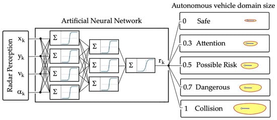 An artificial neural network model was used to assess the safety level of the situation and assign collision risk values. A three-layer neural network model was used, with four input quantities measured by the radar device and one output quantity in the form of collision risk. Nonlinear activation functions were assumed in the first and second layers and a sigmoidal activation function in the third output layer. At each stage and node of the calculation, the algorithm asked the neural network about the collision risk value and generated the appropriate size of the vehicle domain.