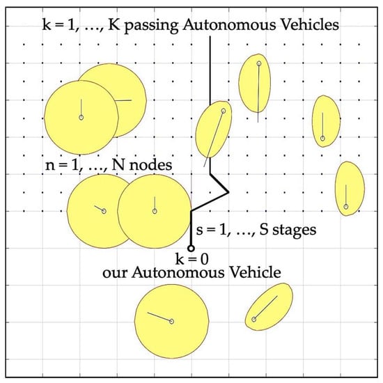 The plane of possible states in the autonomous driving process is treated discreetly, dividing it into stages s, and each stage into nodes n (Figure 3). Then, the possible movement paths of the autonomous vehicle are dynamically programmed, eliminating nodes that are in prohibited areas defined by the neural domains of collision risk. Among all safe paths, the optimal path is selected, ensuring the shortest autonomous driving time topt.