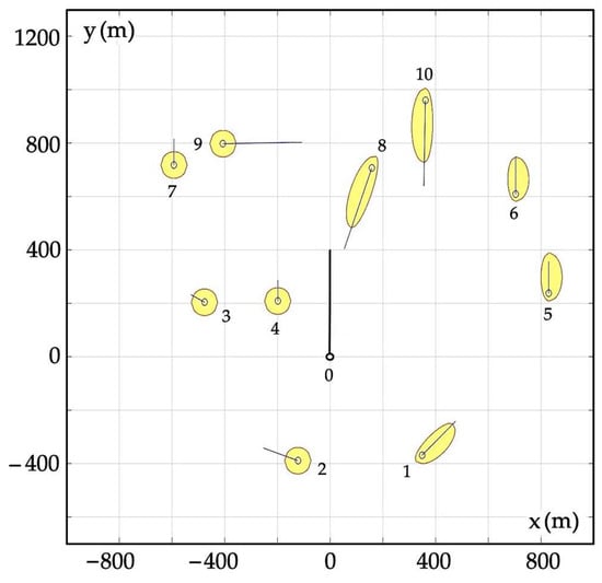 Figure 4 illustrates this situation in the form of object velocity vectors and the collision risk domains assigned to them. However, in accordance with road traffic law, objects to which we are obliged to give way are assigned elliptical domains, while others are assigned circular domains.