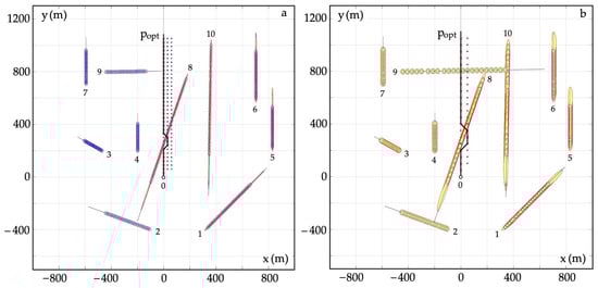 Simulation tests of the safe autonomous vehicle driving algorithm were carried out in various environmental conditions, characterized by the need to maintain a safe passing distance ds. The range of the set value of the safe passing distance ds was from 5 m to 200 m, which corresponds to traffic conditions from good and average to poor. After entering the data describing the situation according to Table 1, the algorithm was run in the Matlab/Simulink software. After a dozen or so seconds, the results were obtained in the form of the optimal path popt of the own vehicle and the trajectories of passing k vehicles with assigned neural domains with variable sizes corresponding to the level of collision risk rk. Thus, Figure 5 shows the optimal safe path of our autonomous vehicle in good object movement conditions, when ds = 5 20 m.