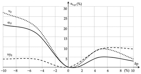 The sensitivity characteristics of optimal safe autonomous driving, presented in Figure 8, were determined at various values of inaccuracy in the perception of motion parameters δp ranging from −10% to 10%.