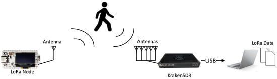 The localization algorithm based on the LoRa signal amplitude utilizes a LoRa transmitter module and a multi-antenna receiver array. The LoRa transmitter module is composed of a LoRa SX1276 chip integrated development board operating at a center frequency of 915 MHz with a bandwidth of 125 kHz, shown in Figure 1a. On the other hand, the receiving module consists of a KrakenSDR and a set of five antennas, with a sampling rate of 1 MHz, shown in Figure 1b. The KrakenSDR is connected to a laptop computer running the Ubuntu operating system equipped with an Intel Core i5 CPU and 16 GB of RAM. The received LoRa signals are then saved to a local file for further processing. Figure 2 shows the process of collecting LoRa signal data.