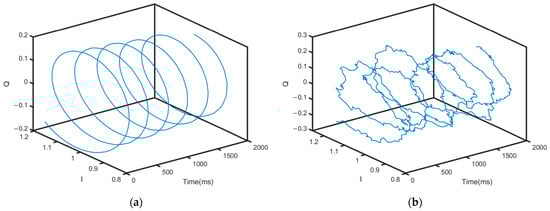 In our study, we employed the tangent vector method, as outlined in reference [21], to calculate the variation in the signal phase induced by human walking. During practical experimentation, the signal ratio changes because different parts of the human body reflect signals as it moves. Moreover, the mobile body obstructs the static path of the signal reflection from stationary objects. As a result, the observed trajectory of the signal ratio changes does not conform to a concentric circle; instead, it exhibits a non-concentric circular pattern. Figure 4 illustrates the comparison between the theoretical and experimental trajectories of the signal ratio changes. The center of this trajectory is notably distant from the origin and deviates from the theoretical model, consequently leading to higher measurement errors.