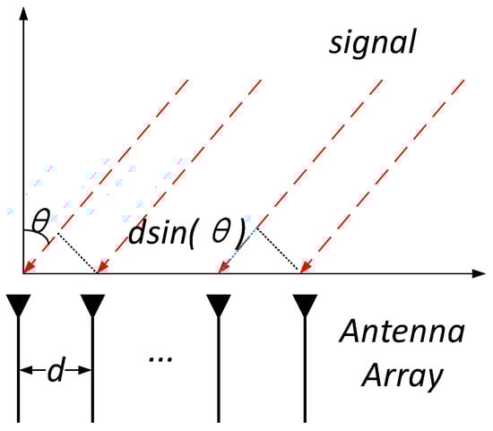 In the context of a single-incidence array, we consider a linear receiving array comprising M antennas positioned at the receiver. The incident signal arrives at the antenna array with an angle-of-arrival denoted as , as illustrated in Figure 6. The separation between the antennas, denoted as d, is set to half the wavelength of the incoming signal. It is important to note that the signal has distinct propagation path lengths at different antennas due to its arrival angle. Since the propagation path is significantly longer than the antenna spacing (k >> d), the path difference between neighbouring antennas can be expressed as k.