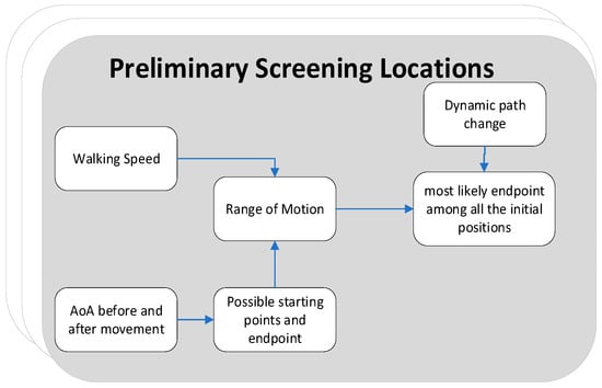 The determination of the target movement range involves the consideration of both the front and rear arrival angles, as well as the walking speed. The extension line of the arrival angle before and after the target’s movement enables the identification of all conceivable starting and ending points. Through a systematic comparison with dynamic path variations, the optimal concluding point among all conceivable starting points can be ascertained, thus yielding the preliminary positioning outcome, as illustrated in Figure 7. The process involves several key steps: