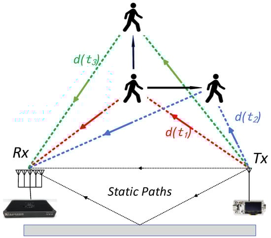 The utilization of RF signals as a means of target localization has emerged as a focal point of contemporary research due to its cost-effectiveness and the absence of device-wearing prerequisites. The fundamental principle involves a transmitter emitting RF signals toward a moving target, which then reflects the signals. These reflected signals are subsequently received, analyzed, and processed by a receiver equipped with various signal processing algorithms, thereby facilitating the extraction of information regarding the moving target. In recent scholarly endeavors, diverse RF signal types, such as WiFi [3,4], frequency-modulated continuous waves (FMCWs) [5], and RFID [6], have been explored. However, these signal types still face challenges such as a limited sensing range and suboptimal penetration.