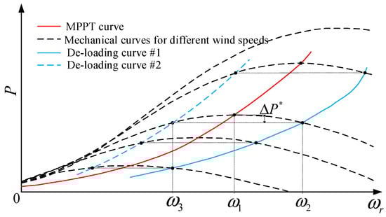 When a DFIG participates in FR through droop control, its rotor speed will decrease or increase according to the sign of ∆f, which leads to the deviation of the DFIG from the MPPT operation curve. Therefore, changes in the MPPT control loop can be expressed in the following expressions: