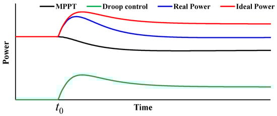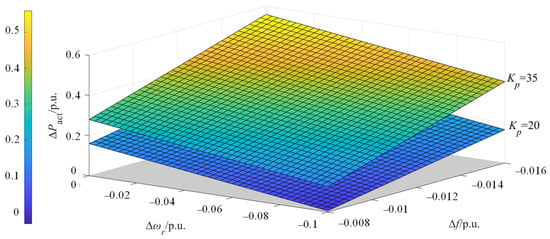 According to Figure 4 and Equation (5), it can be seen that after the disturbance arrives at time t0, as with the increase in ∆f, an increase in ∆P and ∆ωr will be caused, which leads to the deviation of ∆Pact from the ideal power injected by the DFIG into the grid. The deviation in ∆Pact depends on the gain coefficient Kp of the droop control loop and the size of the disturbance.