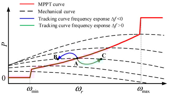 As in Equation (6), in the absence of disturbance, the DFIG operates in MPPT mode. However, when the system detects disturbances, due to the introduction of the coefficient of variation Δk, the DFIG will deviate from the MPPT working point to participate in FR, thus possessing dual FR capability. Specifically, this will happen when the grid ∆f < 0, due to the implementation of positive Δk. The operating point of the DFIG will move to the left of the MPPT curve shown in Figure 6, and the trajectory changes will be represented from A→B. In this case, DFIGs can more actively provide power to maintain the stability of the grid frequency when dealing with disturbances caused by reduced grid frequency. On the other hand, when dealing with grid over-frequency disturbances (see trajectory A→C in Figure 6), due to the Δk being negative, the running point of the DFIG will move to the right, where ωmax and ωmin represent the maximum and minimum values in Figure 6, respectively. This FR response enables the DFIG to effectively absorb the energy of over-frequency and prevent any excessive power imbalance in the system.
