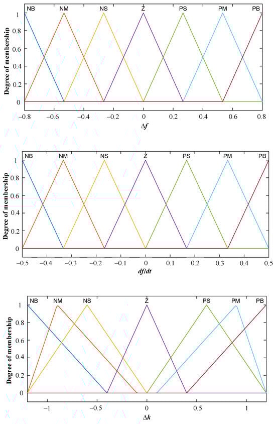 For the fuzzy controller, the variation ranges of ∆f and df/dt are [−0.8, 0.8] and [−0.5, 0.5], respectively. In addition, to avoid the adverse impact of excessive ∆k on frequency regulation, the adjustment range of ∆k is set as [−1.2, 1.2]. To accurately reflect the control concept and avoid increasing the complexity of fuzzy inference rules, this paper divides the input and output fuzzy subsets into seven types, including NB (negative maximum), NM (negative moderation), NS (negative minimum), Z (zero), PS (positive minimum), PM (positive moderation), and PB (positive maximum). This classification helps to simplify the fuzzy logic reasoning system, making it easier to understand and implement. Specifically, the fuzzy subsets of input and output are shown in Figure 7, while Table 1 illustrates the fuzzy logic rules used in this scheme, Considering the subjectivity of the membership function and fuzzy rule setting, it is still possible to improve this optimization in the future. These rules are used to derive the corresponding output under given input conditions. By dividing input and output into these seven types, the design of fuzzy control systems is more interpretable, making system operations more intuitive and clear.