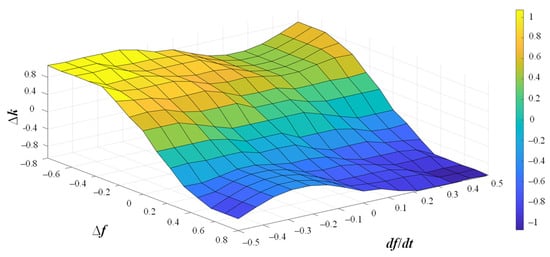 The fuzzy inference principle in Table 1 is that ∆f and df/dt have the same sign. When the system frequency is at the beginning stage of the frequency decrease, ∆f is very small and df/dt is large. Therefore, ∆k should be set to a larger value to prevent further frequency decrease. When ∆f is large and df/dt is small, this indicates that the grid frequency is gradually approaching the lowest point, and ∆k can slightly decrease to avoid the excessive deceleration of the DFIG rotor kinetic energy release. In addition, before the lowest point of frequency, a large amount of power can be released to reduce the maximum frequency offset. When ∆f and df/dt have different symbols, this indicates that ∆f gradually decreases and df/dt gradually decreases to zero. In this case, to avoid the excessive deceleration of DFIGs, ∆k needs to be reduced. This adjustment makes the system more flexible in adapting to changes in grid frequency, avoiding the problem of excessive deceleration. In summary, the output of fuzzy control based on Mamdani type was obtained, as shown in Figure 8.