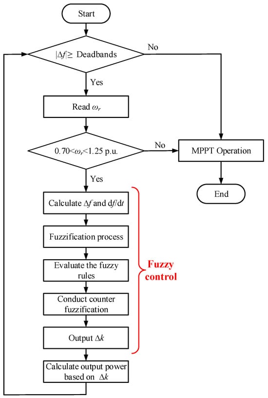 The flowchart of the IDFR strategy based on fuzzy control is shown in Figure 9. When ∆f does not exceed the deadbands, the DFIG runs on the MPPT curve. When the disturbance occurs and ∆f exceeds the deadbands, the DFIG detects its own operating state. If the DFIG speed is within its normal operating range (0.7 < ωr < 1.25), kvar changes according to ∆f and df/dt, and the DFIG absorbs or releases the kinetic energy of the rotor to automatically participate in system frequency regulation due to the presence of ∆k.