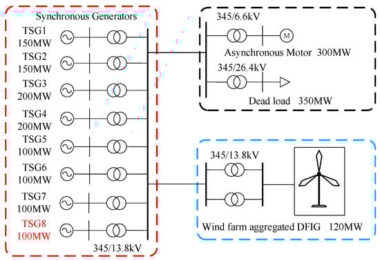 To verify the effectiveness of the proposed IDFR scheme based on fuzzy control, this paper establishes a single-line model system on the EMTP-RV simulation platform. The system includes eight synchronous generators (TSG1-TSG8), a wind farm based on a DFIG, an asynchronous motor with a capacity of 350 MW, and a static load, as shown in Figure 10. The wind farm is formed by the aggregation of 24 DFIG units with a capacity of 5 MW [], and the converters and mechanical subsystems of each DFIG are modeled according to Figure 1.
