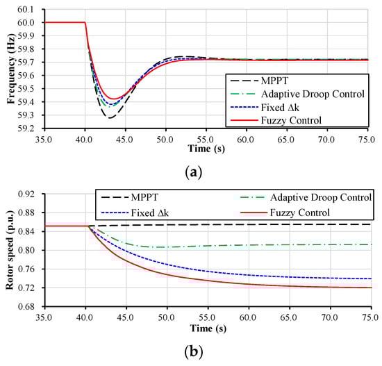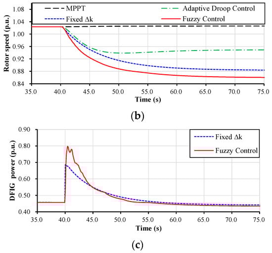 In this case, the wind speed increased to 9.0 m/s, resulting in higher rotor speed and more kinetic energy available for frequency modulation. Since the output power of the DFIG is calculated according to (6), even if the same Δk is used in the FR of fixed Δk, more power could be generated to support the dynamic frequency of the system (see Figure 12c), so that the lowest frequency increased to 59.45 Hz, which is more than that in Case 1 (see Figure 11a,c and Table 4). For the proposed dynamic Δk scheme, due to the increase in rotor speed, more power is injected into the grid, thereby increasing the lowest frequency to 59.49 Hz, as shown in Figure 12a,c.