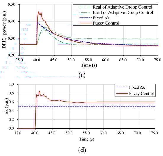 The amount of power released or absorbed by the DFIG depends on the setting of ∆k: even if the use of the large fixed ∆k could improve the frequency regulation capability, the stable operation of the DFIG will not be facilitated due to excessive rotor energy being released or absorbed, and over-compensation for frequency regulation will exist for a small frequency disturbance. On the other hand, if ∆k is too small, the FR capability of DFIGs will not be able to meet the system requirements, and the FR potential will not be fully utilized, especially at high wind speeds.