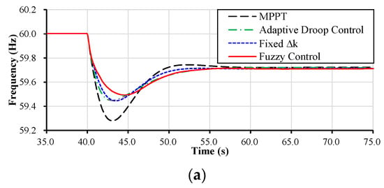 In this paper, the FR performance of the DFIG with MPPT, adaptive droop control [], fixed control coefficient, and proposed dynamic control coefficient (Δk based on fuzzy control) under different wind conditions and disturbances are studied, as shown in Table 2. Among these factors, the Kp of droop control is set to 5% [], and the frequency strategy of the fixed control coefficient is set to 0.5.