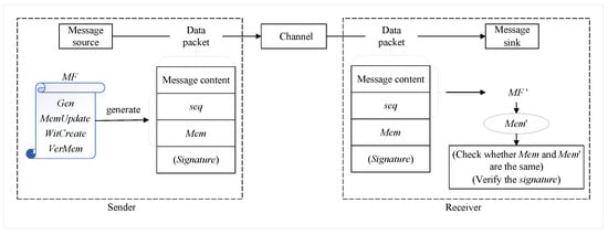 In this section, we elaborate on the design of a memorable communication model based on cryptographic accumulators. This model consists of a closed-loop system with the sender, receiver, and transmission channel, where each entity performs different functions to ensure communication security. On this basis, the memorable communication process is constructed, including the sender’s message sending and the receiver’s message receiving processes.