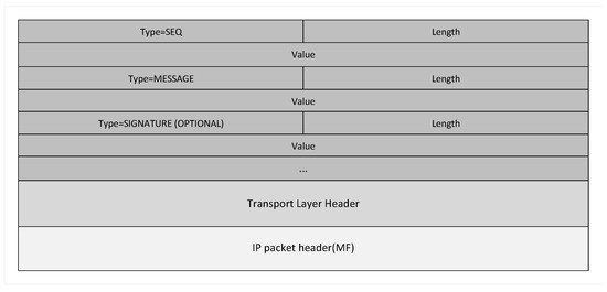 In this method, the specific processes of sending, receiving, and tracing messages are different. This section will describe the specific steps of sending and receiving messages. First, the packet format for this type of data packet during transmission is shown in Figure 2 below. The network layer and transport layer packet formats are consistent with the TCP/IP protocol. The application-layer data is sent in TLV (Type, Length, Value) format, where Type represents the meaning of the field, Length represents the length of the field, and Value represents the value of the field. The important information such as the sequence number, memory value, signature, and data are determined according to the meaning represented by Type.