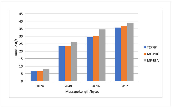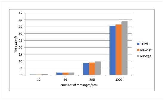 First, we compared the communication time overhead of methods based on , , and protocols. The results indicated that the time consumption for all three methods was of a similar order of magnitude, confirming the correctness of the theoretical analysis. Additionally, the increase in the number and length of transmitted messages resulted in a linear increase in communication time, consistent with the analysis.