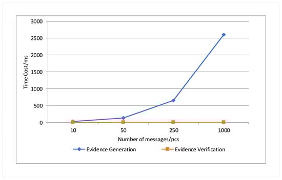 Second, we tested the evidence generation and verification time of under different message lengths and quantities. The results demonstrated that evidence generation time exceeded verification time, and evidence generation was independent of message length but positively correlated with the number of messages. This suggests the method’s efficient traceability.