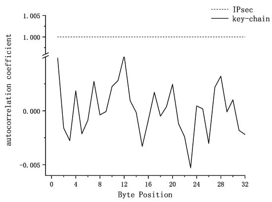 From this, it can be observed that within the same IPsec cycle, the correlation coefficients of chained keys are essentially stable within the range . This indicates that the correlation between each byte of these keys is very low, with almost no linear correlation. In contrast, for IPsec, where the key is not updated, the correlation coefficient remains at 1.0.