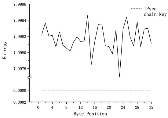 For uniformly distributed data with values ranging from 0 to 255, its entropy value . As shown in the Figure 11, the entropy value is approximately 7.9980, indicating that there is very little correlation between values in the sequence. The sequence tends to be highly random or uniformly distributed. In terms of randomness, this can be considered a positive feature. Overall, the entropy value of the chained keys suggests that the sequence exhibits characteristics very close to a uniform distribution and randomness in information theory. In contrast, due to the lack of key updates, the entropy value for IPsec is 0, indicating that the key remains fixed within a single lifecycle.
