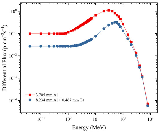 Proton differential flux of two designed shielding materials.