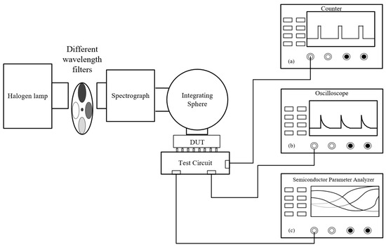The schematic diagram of the electrical parameter testing system used is shown in Figure 3. The halogen lamps provide a stable light source with a wavelength of 350–1100 nm. After passing through the filter, a single wavelength light is generated in the spectrograph. The integrating sphere performs multiple diffuse reflections on the incident light to improve the uniformity of the light incident on the test sample, ensuring photostability during sample testing. In terms of parameter measurements, the Keysight semiconductor parameter analyzer was used to measure the I–V characteristics of the device before and after irradiation, and an oscilloscope was used to measure and observe the SPAD’s pulse output waveform. The external test circuit consisted of a passive quenching circuit with a 50 kΩ resistor. An external counter was used to accurately measure the dark count.
