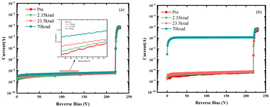 I–V characteristics of SPAD after γ irradiation under the (a) “OFF”-bias condition and (b) “ONM=100”-bias condition.
