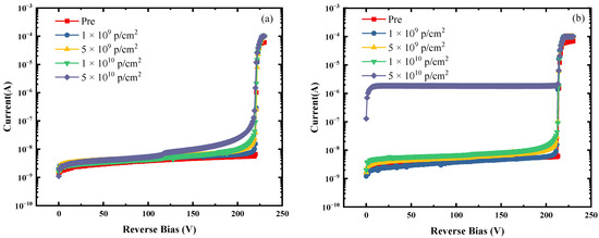 The I–V characteristics of the SPAD before and after 30 MeV proton irradiation are shown in Figure 5. As shown in Figure 5a, the leakage current increases slightly with the increase in proton irradiation fluence under the “OFF”-bias condition. At a reverse voltage of 80 V, the leakage current increases from 3.49 nA to 4.66 nA at a fluence of 5 × 1010 p/cm2. However, when the reverse voltage reaches 117 V, the leakage current exhibits a “step” increase, similar to the “punch-through” phenomenon between the multiplication region and the absorption region [38]. At a reverse voltage of 200 V, the reverse leakage current increases from 5.42 nA before irradiation to 24.7 nA after irradiation. It can be seen that as the reverse voltage increases, the leakage current also increases, but the breakdown voltage of the SAPD device does not change significantly before and after irradiation. The results of proton irradiation under the “ONM=100”-bias condition are shown in Figure 5b. The leakage current also gradually increases with the accumulation of fluence. However, for the 1 × 1010 p/cm2 proton fluence required by the on-orbit shielding design, the leakage current of the SPAD device increases from 5.68 nA before irradiation to 14.3 nA after irradiation at an operating voltage of 200 V. But when the proton fluence accumulates to 5 × 1010 p/cm2, the leakage current suddenly increases to 1.82 μA, which means there is serious damage. This indicates that under proton irradiation, with an “ONM=100”-bias condition, the damage to the SPAD is more severe compared to that caused by the “OFF”-bias condition.