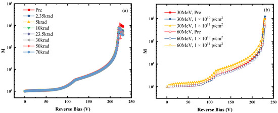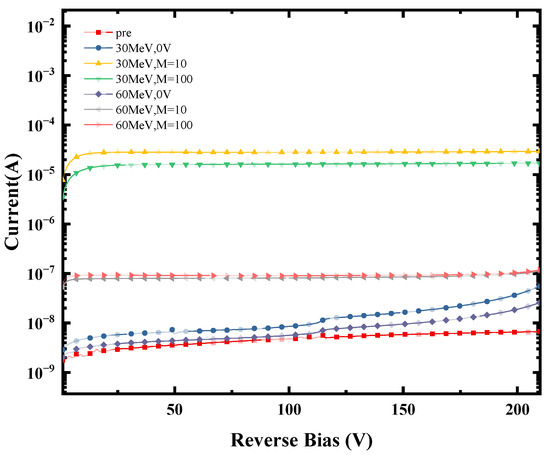 Figure 7b shows the gain variation at different reverse voltages after 30 MeV and 60 MeV proton irradiation. From the figure, it can be seen that at a fluence of 1 × 1010 p/cm2, the gain of the SPAD remains almost constant at both energies. However, when the accumulated fluence reaches 1 × 1011 p/cm2, the gain starts to increase, and the gain after 30 MeV proton irradiation is more significant than that after 60 MeV proton irradiation, which indicates that 30 MeV protons cause more serious radiation damage to the SPAD. By observing the change in photocurrent and dark current before and after irradiation, it was found that both currents increased after irradiation. However, the dark current and the both increased significantly compared with those before irradiation. The increase in the is more significant, resulting in a decrease in the photocurrents without bias voltage after irradiation, and a consequent increase in the gain. The gain (M) is calculated as follows: